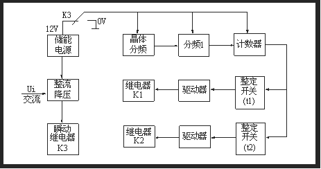 繼電器有晶體振蕩器、分頻器、整定開關(guān)、驅(qū)動電路和電源回路等組成。當(dāng)繼電器施加額定電壓時,繼電器內(nèi)部瞬動繼電器和兩個延時繼電器瞬時動作,觸點切換,并使電源回路與計時回路處于失電狀態(tài),以提高繼電器抗干擾性能。當(dāng)輸入電壓大大降低或完全消失時,瞬動繼電器瞬時返回(兩個延時執(zhí)行繼電器仍處于動作狀態(tài)),觸點也瞬時返回,使儲能電源接通計時回路,晶體振蕩產(chǎn)生時鐘脈沖,經(jīng)分頻后得到10ms計時脈沖,計數(shù)器對計時脈沖計數(shù),當(dāng)所計脈沖數(shù)與整定開關(guān)值符合時,驅(qū)動執(zhí)行繼電器返回,完成斷電后延時返回的功能。原理圖如下圖所示